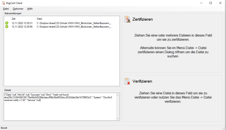 All certificates can be easily verified by using the webapplication, the client or third party verification services like described in one of our last blog entries (New Austrian Blockchain - verification service "Dual-Verify").